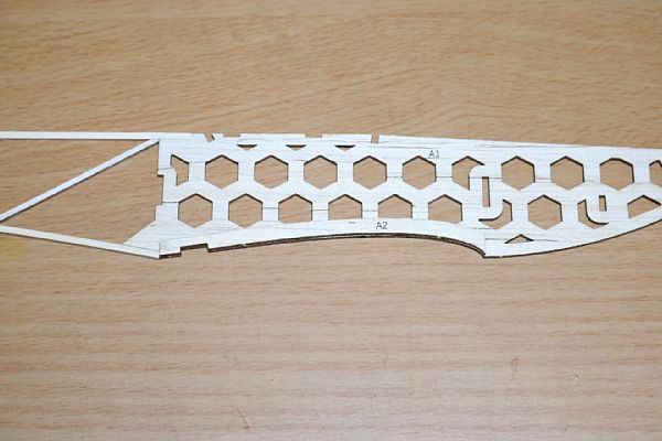 ![]() フィレットは軽量な10mmバルサから削り出しです。形状が複雑なので現物合わせで調整しました。これで約0.1gです。 |