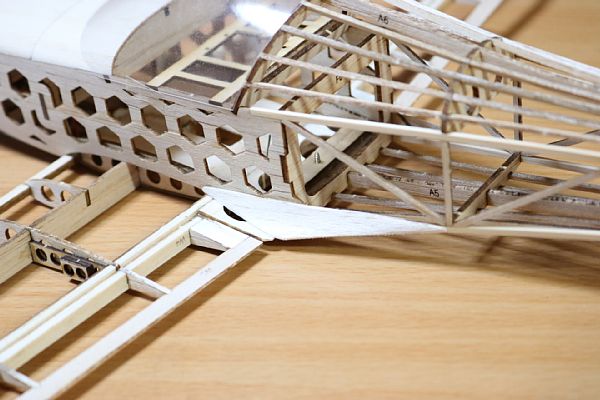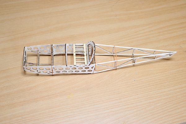 ![]() 胴体後ろは定番のトラス構造です。長手方向だけ2mmヒノキ棒を使いますが、2x1.5mmに削って使用します。 |