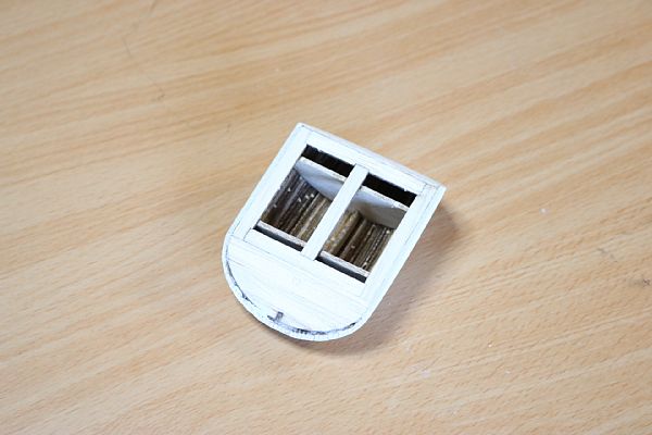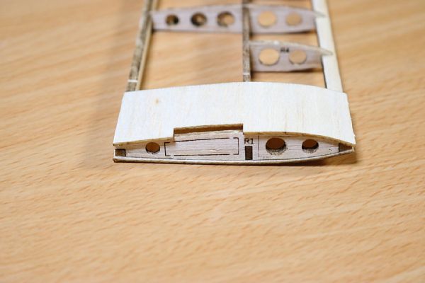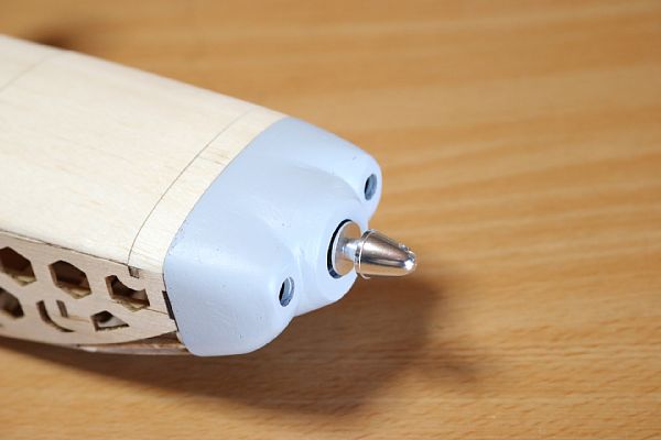 ![]() 機首のキールは前輪の受けも兼ねます。写真は分かりにくいですが、ベニヤを貼り合わせて穴を作っています。 |