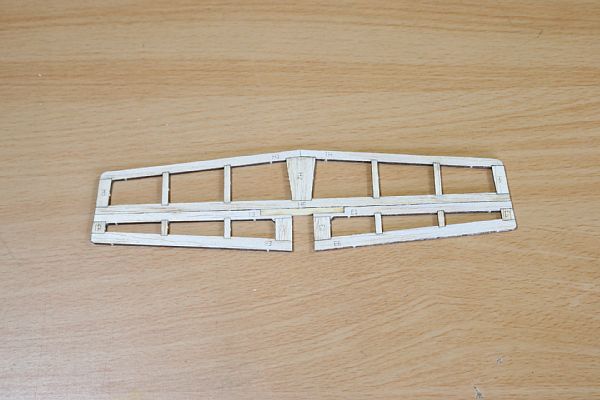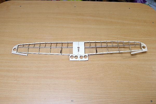 ![]() 原寸図面の上で主翼を組み立てました。根元のリブR1はR2と2枚重ね、また3本目のリブR5には脚取り付けのベニヤ部品を貼ってあります。 |