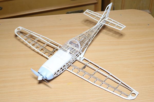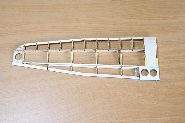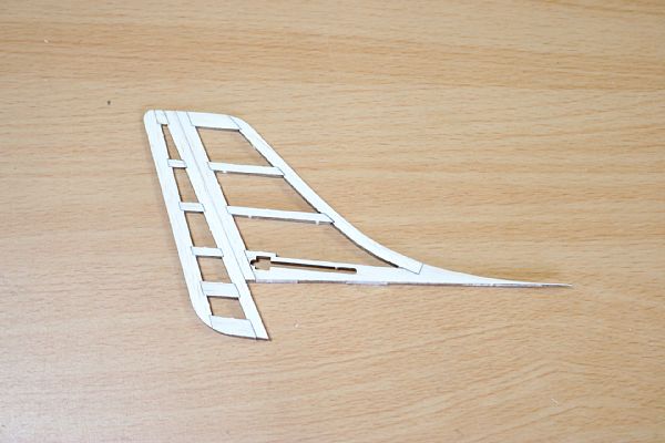 ![]() 垂直尾翼も組み立てました。こちらもラダーの後縁を薄く、垂直安定板の前縁を丸くサンディングしました。なお、3mmバルサです。 |