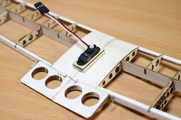 ![]() エルロンサーボを仮止めしてみました。サーボリードが短いので交換が必要だと思います。 |