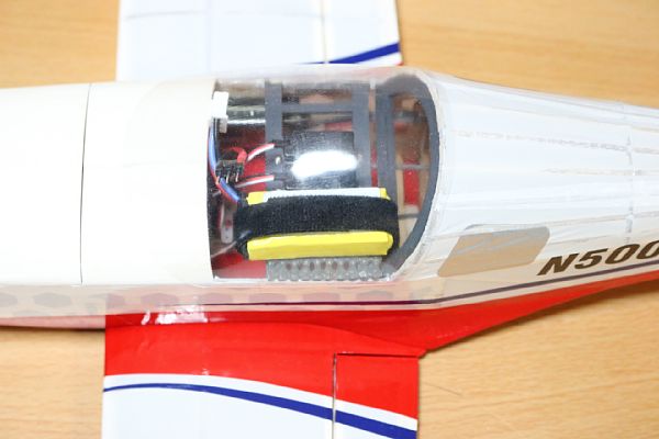 ![]() 何とか100g未満になりましたが、重心位置が思いっきり前です。重りで調整できませんのでバッテリーをキャノピー内に移動しました。 |