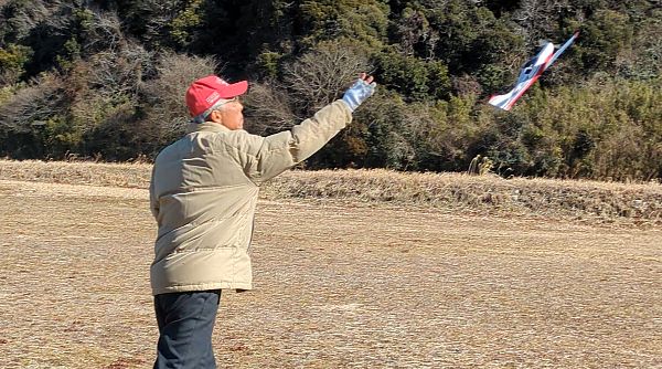 | 2026年2月5日 リベンジ飛行に成功しました。 草むらが無いので結局滑空テストは行いませんでした。 手投げ発進はスロットルを50%とし、上に向かわないように注意して行いました。おかげで機体が暴れることもなく落ち着いて操縦することができました。飛行は左に大きく傾きます。また頭上げの傾向があります。それでもトリムが合うと、初飛行が嘘のように安定した飛びです。 飛行の様子はYoutubeをご覧ください。 https://www.youtube.com/watch?v=4SyxZtoOZIE ![]() 左に傾くのは反トルクではないか?サイドスラストを付けるとよいというアドバイスがありました。また頭上げは重心がまだ後ろではないかと思います。 まだ調整が必要です。 |