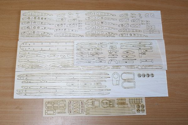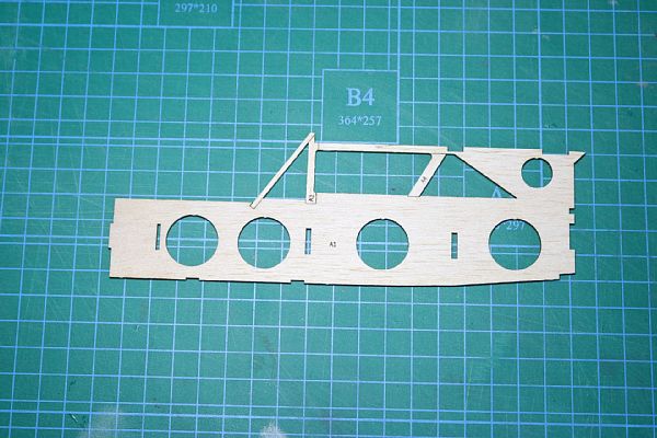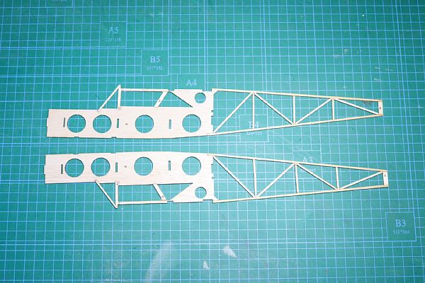 |  レーザーカットしました。1.5mmが2枚、2mmが2枚、3mmが1枚、1.2mmベニヤが1枚です。タイガーモスに比べ部品が少ないです。 |  胴体側板から組み立てます。メインの側板に、バルサの目の方向を変えるために窓枠の部品を接着しました。 |