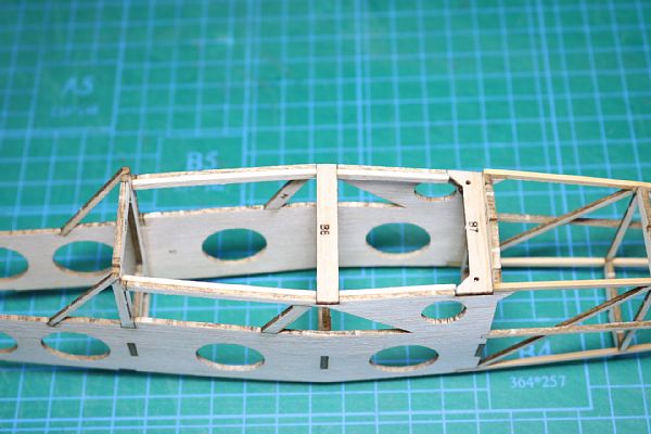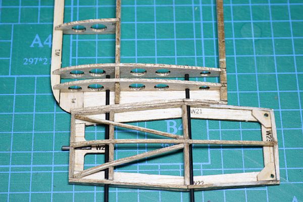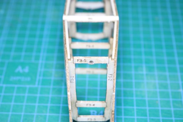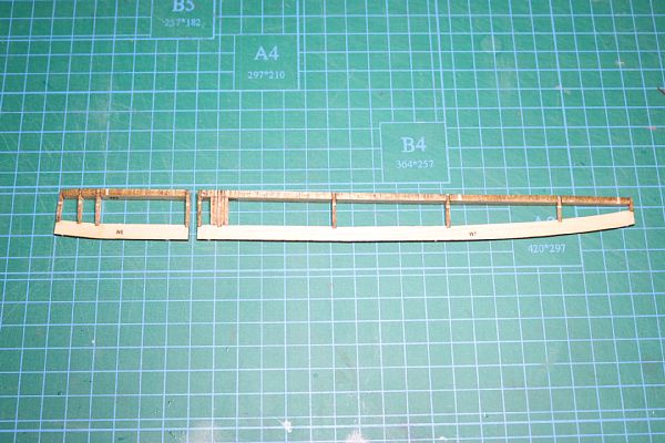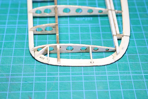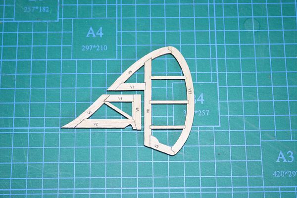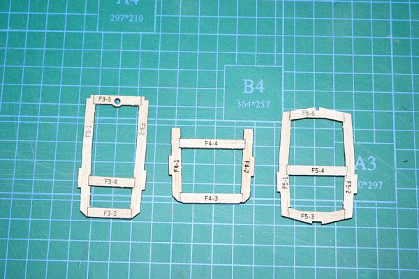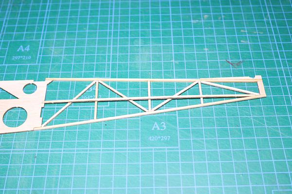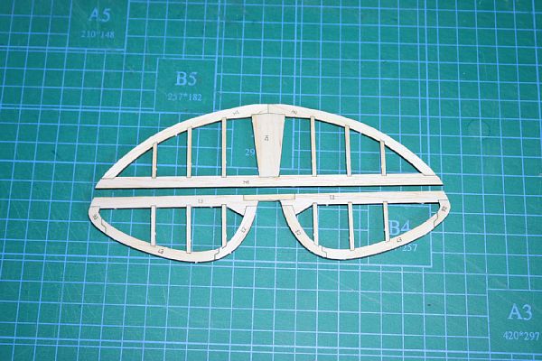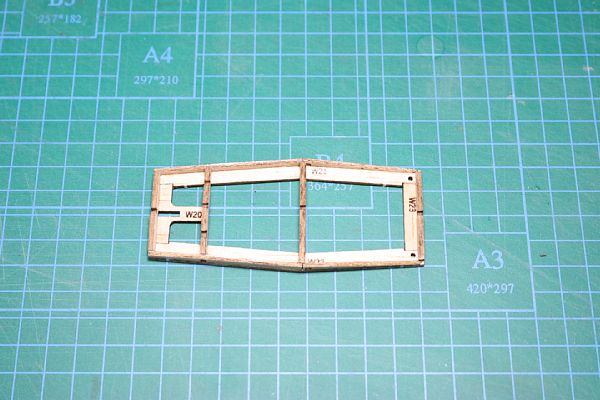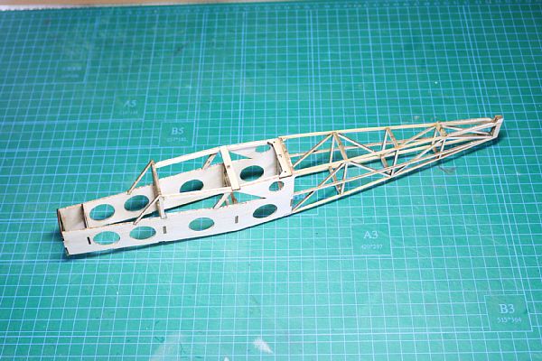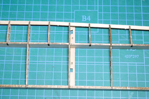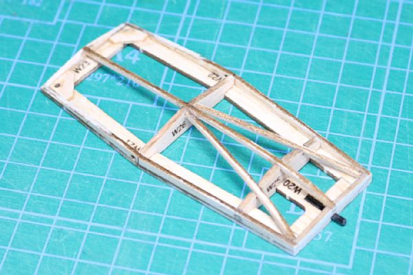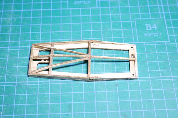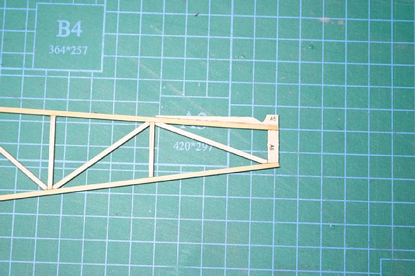 |  原寸図面の上で後ろのトラス構造を組み立てます。上下の長い棒は1.5x2mmのヒノキ棒、ほかは1.5x2mmのバルサです。 |  左右2枚を組み立てました。なお、刻印のある面を胴体内面にします。 |