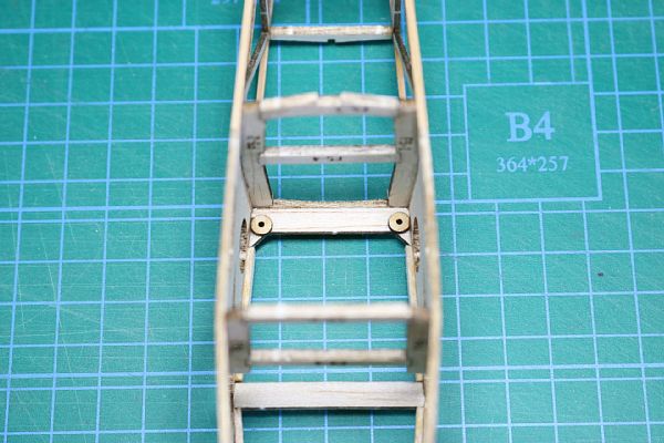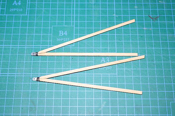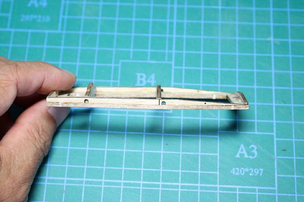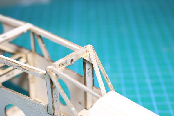 |  ストラットを組み立てました。三角頂点の取り付けの部品は0.3mmのアルミ板です。糸で縛って瞬間を流せばガッチリつきます。 |  胴体側の受けは1.2mmベニヤを写真のように取り付けました。 |