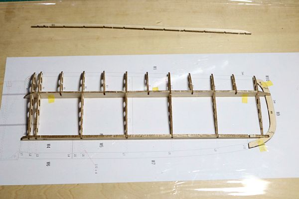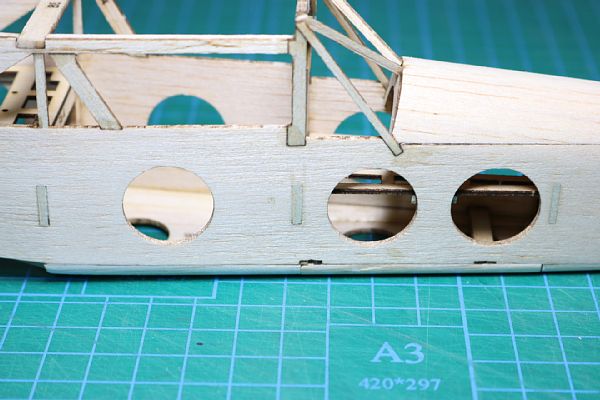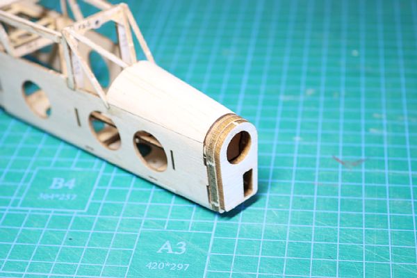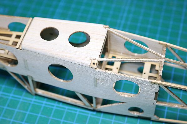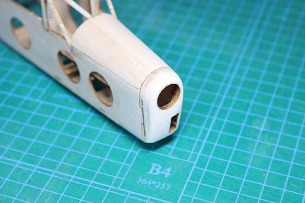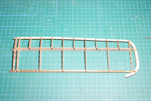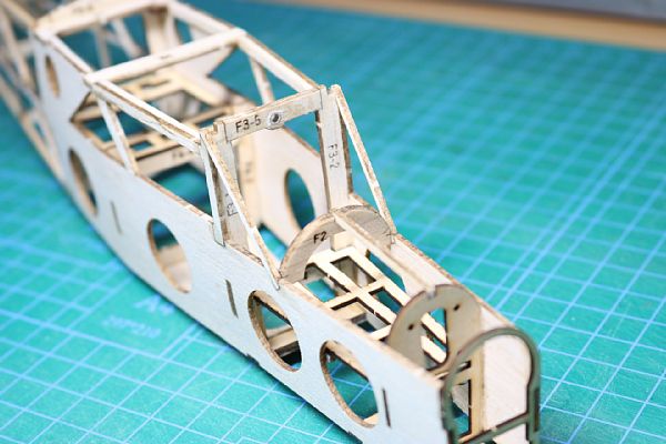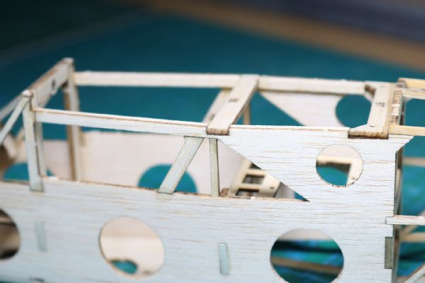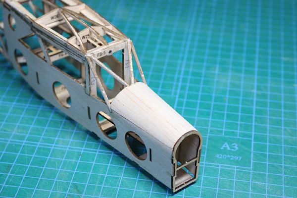 |  インパネに当たるF2は、ほぞ組みがないため寸法をあたって位置決めしました。F1との間に背骨を入れてあります。 |  プランク材を曲げ癖を付けてから貼りました。現物合わせで微調整しています。その後、操縦席の窓枠(斜めの棒)を貼りました。 |