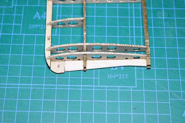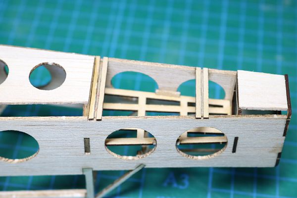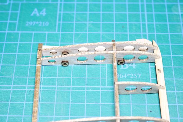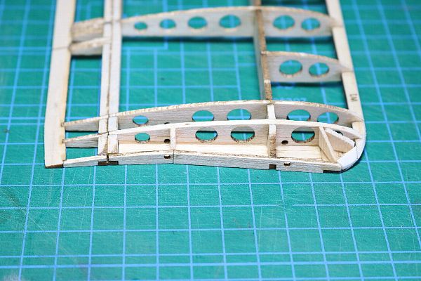 |  翼の根元だけプランクします。P1と書いたパーツ以外は後で追加したもの。リブのガイドの役目もあります。 |  カンザシの穴に補強のベニヤを接着しました。 |