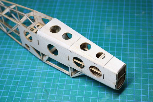 |  胴体後部に水平尾翼の台を接着しました。 |  胴体の断面を太鼓腹にするために、真ん中にバルサ棒を取り付けました。なお、内面か外面かちゃんと確認しないと大変です。 |