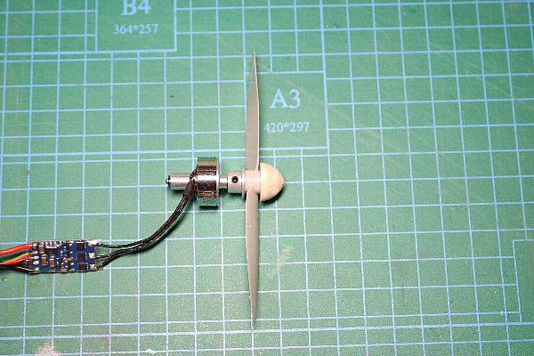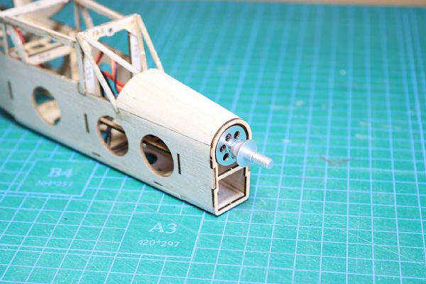 |  上の写真ではコーナーに隙間が空いていますが、3mmバルサを埋めてR形状にサンディングしました。 |  モーターの組み込みはかなりアクロバットです。アンプを付けたうえでアンプをF1の穴から胴体に差し込んでからモーターマウントをF1にねじ止めします。 |
