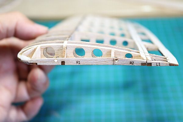 |  中央翼を使って現物合わせで根元のリブR1とR2を接着します。 |  エルロンとフラップを組立て。 |