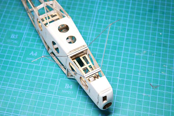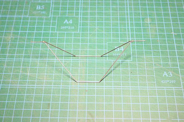 |  脚は0.8mmピアノ線で作りました。図面に合わせて成形し、胴体の上で現物合わせで半田付けします。 |  歪みもなく出来上がりました。このように前後のピアノ線を半田付けすれば、0.8mmでも強度は十分です。 |