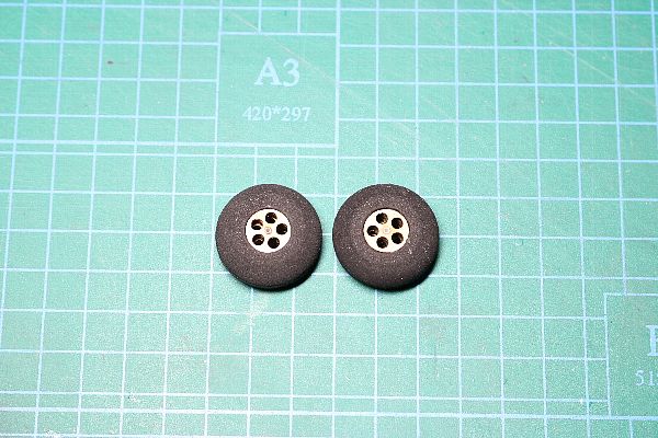 |  小さなパーツですが、スピンナーを作りました。本体はバルサを積層して、中にM5のプラナットを埋め込んでいます。 |  タイヤを作りました。ホイールはバルサとベニヤを貼り合わせ、タイヤ本体は5mmウレタンスポンジを貼り合わせています。 |