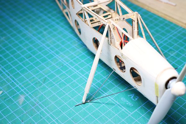 |  脚のストラットは1.5mmバルサです。右側に脚の軸に取り付ける銅線の輪、左は窓枠に虫ピンで固定します。どちらも糸で縛って補強してます。 |  こんな具合に取り付けます。脚には接着しないつもりです。 |