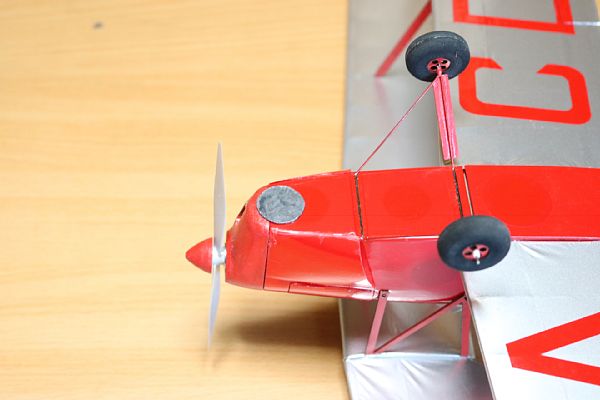 | 反省点 良かったこと (1)複葉機でもアンダー100gで作ることができました。 (2)1セルバッテリーの使いこなしを勉強できました。 (3)軽量化は努力すれば報われます。 悪かったこと (1)フィルムのしわが目立ちます。フィルムが古くて糊が劣化したためではないかと思います。 (2)エルロンのトルクロッドの設計が不十分で、手直しが生じました。 (3)機首はもう少し細くできるとスケール感が増します。 (4)上翼と下翼の平行が少しズレています。 |