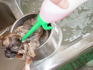 | 75日令、初めてのシャンプー。 子犬にとっては、何をされているのかわかりません。安心感を与えながら洗います。